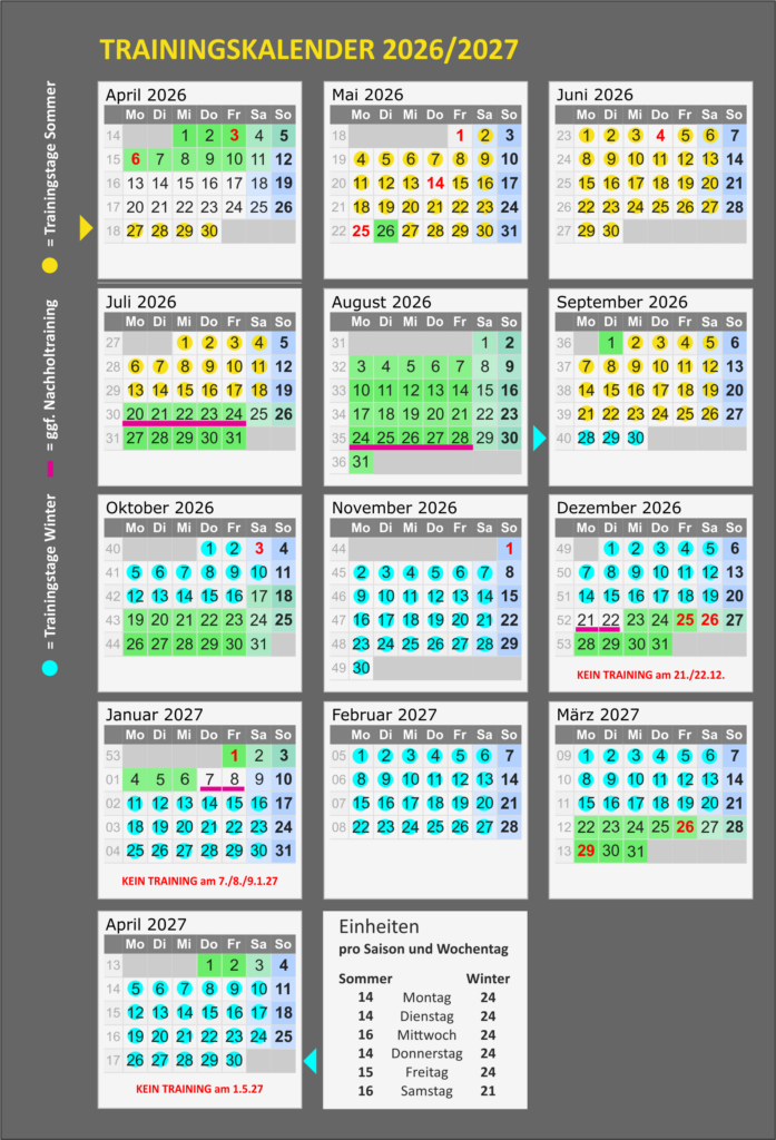 Kein Training in den Schulferien NRW und an Feiertagen.